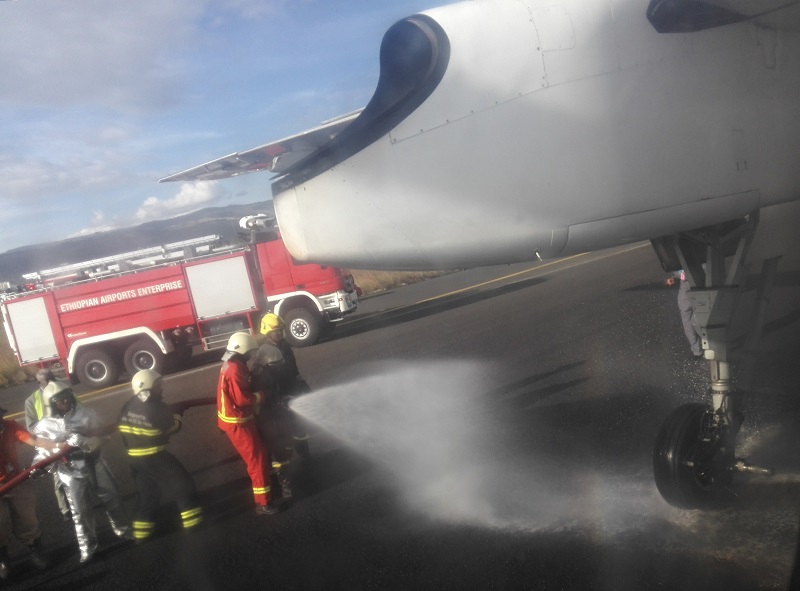 The wheel, one of two on the left side of the plane, dropped off as the Bombardier Q400’s landing gear retracted after take-off. All 55 passengers and 4 crew members onboard escaped uninjured. According to the passengers whom Awramba Times spoke to, one of the passengers sitting in the window seat witnessed the wheel fall to one of the crew members. After a while, the captain announced to the passengers that he has decided to land them safely back at the Addis Ababa, Bole International Airport. After circling on air for nearly half an hour to burn fuel, the captain took the plane down for landing, though it veered to the right and made he was able to hold the aircraft steady and landed it peacefully Around 4:30 pm local time Many passengers of the aircraft hailed the pilot as a hero. Some even demanded to meet the pilot at the cockpit to express their gratitude for a job well done under very stressful circumstances. (Awramba Times)