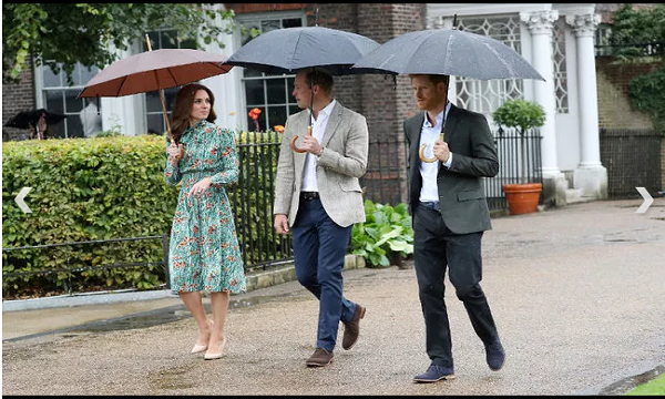 In the pouring rain, the royals huddled under umbrellas to meet with representatives from charities that the late princess supported. Diana’s children have promised to carry on her charity work and chatted animatedly with their visitors.